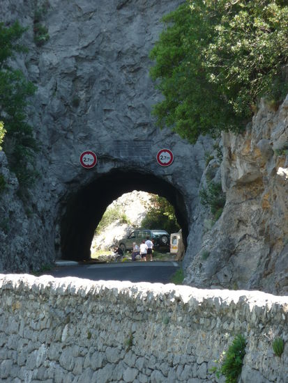 Zurück zu unserem Ausflugstag: wir fuhren über Tautavel (hier wurden in einer Grotte Schädel, Knochen und Werkzeuge der ältesten Europäer gefunden, die vor 450.000 Jahren hier lebten) und die D117 bis St.-Paul-de-Fenouillet. Nun ging es auf einer engen Straße hinein in die Gorges de Galamus und in eine spektakuläre Bergwelt. Wohnmobile sind hier verboten.