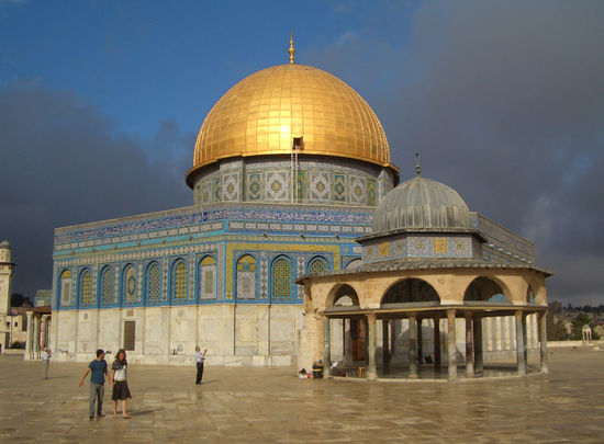 Der Bauherr des bedeutendsten islamischen Heiligtums in Jerusalem war Ab del-Malik (683 - 705), der fünfte Kalif aus dem Omaijadenhaus. Er ließ über dem heiligen Felsen Morija einen achteckigen, überkuppelten Zentralbau errichten, dessen harmonische Wirkung das Resultat genau berechneter Proportionen ist. Die prächtige Fassade ließ der osmanische Sultan Suleiman im 16. Jh. mit kunstvollen Fayencen verkleiden, die elegante, 33 m hohe Kuppel erstrahlt seit ihrer Restaurierung 1958 bis 1964 in vergoldetem Aluminium. König Hussein von Jordanien finanzierte 1993 die Erneuerung der Kuppelvergoldung - rund 8 kg 24-karätiges Blattgold wurden verarbeitet. Bekrönt wird die Kuppel von einer 3,6 m hohen Mondsichel.