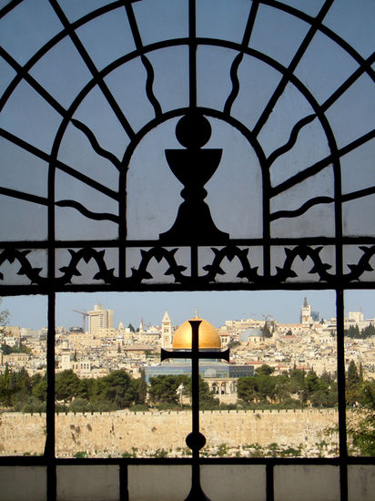 Wer in dieser Kirche die Eucharistie feiert, genießt - wie zur Zeit Jesus - einen herrlichen Blick auf die Heilige Stadt, genau auf den Felsendom und die Grabeskirche.