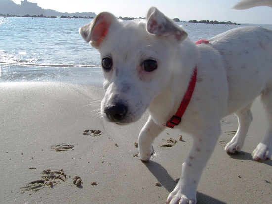 Ich genieße einen Tag Sonnenschein und komme innerlich wie äußerlich zur Ruhe. 1500 km musste ich fahren, um das zu erleben. Bei Pepper dagegen ist an Ruhe nicht zu denken. Mein kleiner Winterhund flippt geradzu aus vor Begeisterung über den "warmen Schnee". Natürlich versucht sie alles genau so zu machen wie sonst - die Nase reinzuschieben und vor allem "große Stücke abzubeißen". Spuckend und niesend ist sie eine ganze Weile damit beschäftigt herauszufinden wo die Unterschiede zwischen Schnee und Sand liegen.