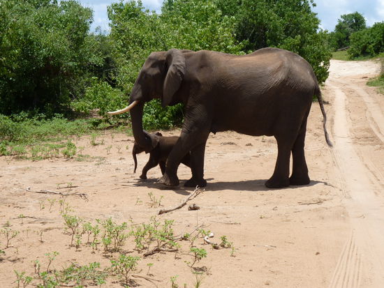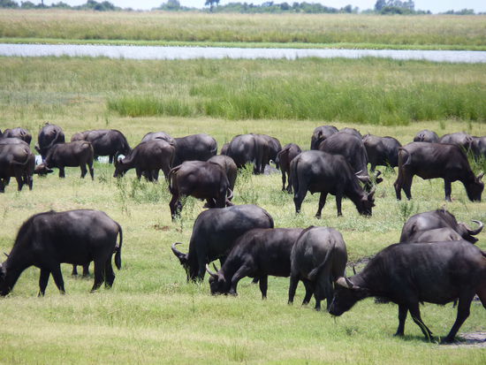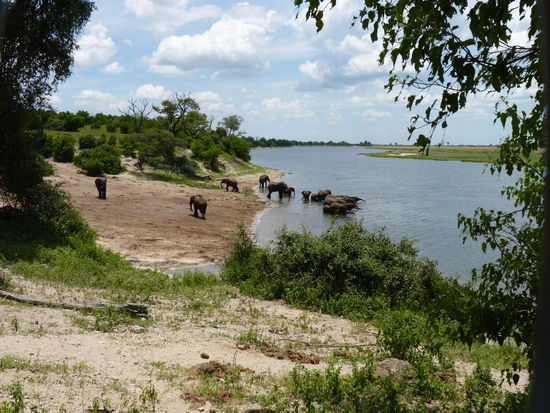 5.00 Uhr Razz klappte den Truck auf und fing an Kaffee zu kochen .Ich glaub ich spinne. Noch müde krabbelten wir aus unseren Zelten. Nach einem Pott Kaffee ging es duschen. Danach bauten wir die Zelte ab. Da mußte aber jede Falte sitzen sonst gingen die Verschlüsse nicht zu. Anschließend waren wir fix und fertig, ich glaub es wäre besser gewesen erst danach zu duschen. Das Frühstück viel recht spärlich aus, aber daran sollten wir uns gewöhnen. 7.30 fuhren wir los zum Chobe Nationlpark, der bekannt ist für seine Elefanten. An der Grenze von Botswana nach Zimbabwe war es so heiß das der Teer schmolz . Dort zockte man uns gleich mal 30 Dollar für das Visum ab. Gegen 11 Uhr gelangten wir in den Park. Wir stiegen in einen kleinen Truck um ,und machten unsere 1.Safari. Diese dauerte ca. 3 Stunden. Uns begegneten viele Antilopen, Marabus, Wasserschweine, Hippos ,Warane, Wasserbüffel,eine Löwenfamilie und meine Elefanten. Die Gegend war sehr grün und es gab viele Wasserflächen. Unser Guide vom Park wußte natürlich wo er suchen mußte und so fanden wir auch die große Elefantenherde, die gegen Mittag zum Fluß zog. Gemächlich troteten sie auf uns zu,die großen Riesen. Vorsichtig schauen sie aus dem Dickicht bevor sie es verlassen. Dann ziehen sie in einer Reihe an uns vorbei. Viele Babys sind dabei die ständig durch die Beine der Mütter rennen. Sie kennen noch keine Angst,so tolpatschig und arglos wie Kinder so sind. Ein Riese blieb vor uns stehen,groß grau, voller Falten mit 2 riesigen Stoßzähnen schaute er uns an schüttelte den Kopf, blickte zum kleinen und gab uns zu verstehen bis hierher und nicht weiter .Dann gingen sie zum Fluß. Wir folgten ihnen. Ich setzte mich zwischen die Büsche und beobachtete sie eine Weile. Ich hätte ewig dort sitzen können, doch lange blieben sie nicht. Nachdem sie ihren Durst gestillt haben und ein erfrischendes Bad nahmen zogen sie weiter. Es war einfach toll. Auch wir machten uns auf den Weg und suchten die Löwen,die wir dann auch fanden. 2 Löwinen und ihre Kinder lagen unter den Bäumen und machten Mittagsruh. Gelangweilt sahen sie zu uns rüber,ließen sich aber nicht stören. Es war ein sehr schöner Tag. Wir holperten über Stock und Stein,wurden tüchtig durchgeschüttelt, aber haben dafür viel gesehen.Leider keine Giraffen und Zebras. Dann ging es zurück zum großen Truck wo schon der Mittagsimbiß auf uns wartete. Es gab Sandwich und Obst bevor es weiter ging. Der Weg führte uns zum Victoria-Fall-In zu unserer nächsten Logde. Sie lag etwas abseits war schon älter,aber schön und hatte einen Pool. Gleich nach der Ankunft hatten wir eine Besprechung was wir unternehmen wollen. Es gab einiges zur Auswahl. Ich endschied mich für einen Tandem -Zipplein-Sprung und für einen Rundflug mit dem Heli über die Vic.-fälle .Am Abend wurden wir vom Koch der Anlage verwöhnt. Zum Essen kamen noch ein paar Einheimische sangen , tanzten und trommelten für uns.