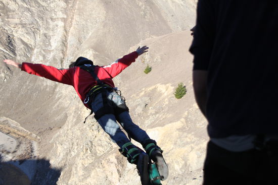Bei der Fahrt von Wanaka nach Queenstown blieben wir bei der Karawau-Bridge stehen, wo das Bungeejumpen (43m) erfunden wurde. Dort sahen wir ein paar Springern zu und ich meldete mich für den Nevis-Bungy (134m) für den nächsten Tag an.