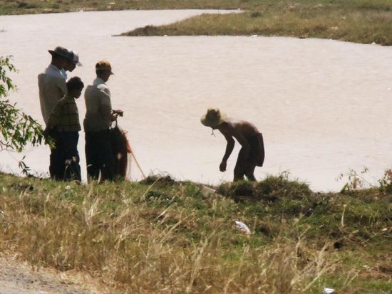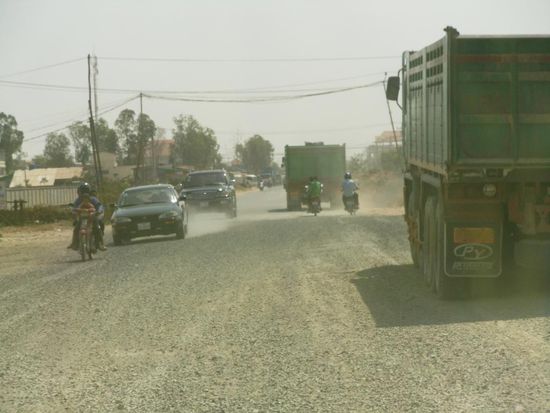 Es sind nur rund 230 Kilometer und die Strasse soll nach den Angaben welche wir haben, gut sein. Wir rechnen also mit etwa drei Stunden Fahrt. Ich verfahre mich bei der Ausfahrt aus Phnom Penh, weil ich das Gefuehl habe, wir muessen zuerst Richtung Norden fahren. Ich habe vor fuenf Tagen bei der Einfahrt in die Hauptstadt ein Strassenschild gesehen, welches den Weg nach Sihanoukville angezeigt hat. Obwohl Patric mir ein dutzendmal gesagt hat, wir seien falsch, fahre ich weiter in diese Richtung. Nach einem Umweg von rund fuenfzig Kilometer finde ich dann auch dieses Strassenschild. `Viele Wege fuehren nach Rom`.