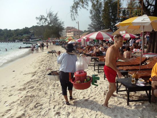 Unser Beach ist etwa zwei Kilometer lang und es hat etwa fuenfzig Bars und Restaurants. Tagsueber hat es auf dem Sandstrand Liegestuehle, welche man kostenlos benuetzen kann. Am Abend werden diese Liegen durch kleine Tisch und bequemen Korbstuehle ersetzt. Vor jedem Restaurant wird ein Grill aufgestellt wo man gemuetlich sitzen, etwas Trinken und sehr gut essen kann. Es hat viele Touristen in fast jedem Alter hier. Tagsueber liegen wir am Strand und baden in dem schoenen Meer. Am Abend geniessen wir einen Apéro am Strand, essen etwas am Strand oder gehen in die kleine Ortschaft Abendessen. Auch hier versuchen viele Menschen mit dir ein Geschaeft zu machen. Es hat wieder die jungen Maedchen, welche anstelle von Buechern hier selbstgebastelte Armbaender und Schluesselanhaenger verkaufen. Frauen die dich massieren, die Haare am Koerper entfernen und Finger- und Zehennaegel schneiden wollen. Es gibt Frauen mit einem Holzkohlengrill, welchen sie an einem Stab quer ueber der Schulter tragen und auf welchem sie Fischspiesse grillieren. Junge Maenner verkaufen Sonnenbrillen und ganz kleine Kinder sammeln leere Aludosen und Flaschen. Natuerlich hat es auch sehr viele Bettler am Strand. Man sieht vor allem viele verkrueppelte Maenner, meistens ohne Beine und Arme, welche sich auf dem Boden kriechend fortbewegen. Vermutlich sind sie alle Opfer der vielen Landmienen, welche es in diesem Land noch gibt.