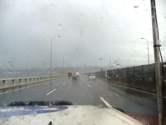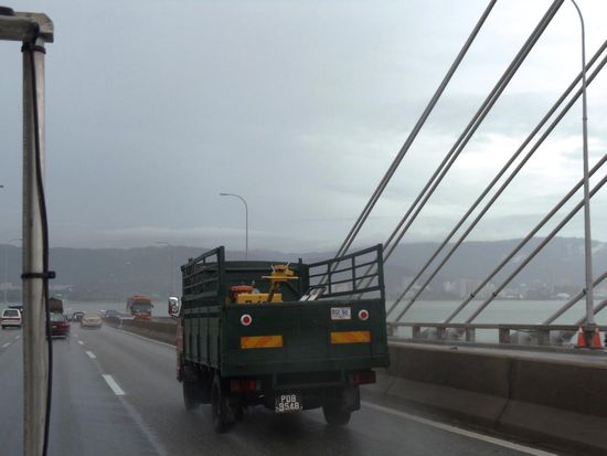 Bei starkem Regen überqueren wir die 1985 erstellte und 13,5 Kilometer lange Brücke Richtung George Town.
