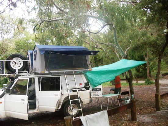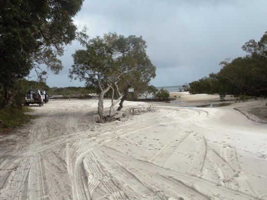 Unsere erste Übernachtung auf Fraser Island am Waddy Point. Bei unserer Ankunft begann es zu regnen und wir montierten die Blache, welche uns Tobi (nomoll Dangge Tobi..) geschenkt hat.