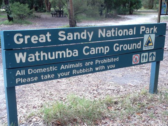 Am nächsten Morgen stehen wir früh auf, kochen Kaffee und räumen unsere Zelte zusammen. Das Wetter sieht ein wenig besser aus und wir fahren mit der Hilfe unserer kleinen Karte quer über die Insel. Unsere erste Nacht haben wir an der Ostküste verbracht. Die zweite Nacht wollen wir an der Westküste verbringen. Die Stassen im Landesinnern sind sehr schmal und schwer befahrbar. Das Französische Paar hat uns den Typ gegeben, wir sollen an die Wathumba Beach fahren. Die ganze Insel ist etwa hundert Kilometer lang und zwanzig bis dreissig Kilometer breit. Unseren zweiten Campingplatz erreichen wir um die Mittagszeit. Bei Sonnenschein können wir unser Lager aufstellen. Zur Sicherheit befestigen wir unsere Blache am Auto, so dass wir bei Regen schnell geschützt wären. Wir sehen nun auch die ersten Dingos. Überall sind Warnschilder aufgestellt, welche einem auf die Gefahren und den Umgang mit diesen Tieren aufmerksam machen. Man wird gewarnt von den Haien und Seeschlangen im Meer, von den Krokodilen und von den Dingos. Einzig von den Mücken wird man nicht gewarnt. Es hat hier aber tausende von Mücken und wird sind im nu zerstochen. Als ob wir es geahnt hätten, fängt es genau an zu regnen, als wir unser Essen einnehmen wollten. So sitzen wir wiederum bei strömenden Regen unter unserem provisorischen Zelt beim Essen. So richtig gemütlich ist es nicht und so gehen wir auch an diesem Abend früh in unsere Zelte. Wir lesen noch ein wenig und schlafen friedlich ein. Dieser Campingplatz ist nicht Dingosicher. Es hat hier keinen Zaun und wir sind die einzigen Camper auf diesem Zeltplatz. Wir räumen unsere Küche auf und versorgen alles im Auto. Vor allem den Abfall muss man gut einschliessen. Es ist ein unglaubliches Gefühl, bei Nacht und Regen im Zelt zu liegen. Man hört die verschiedensten Geräusche. Vögel pfeifen und rufen, man hört ein Rascheln im Gebüsch und hat einfach das Gefühl, nicht ganz alleine zu sein. Beim Gang auf die Toilette - in der Nacht und im Dunkeln - hat man schon ein wenig ein ungutes Gefühl.