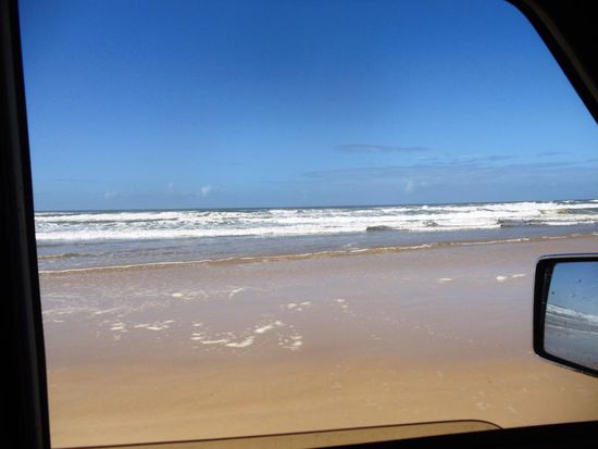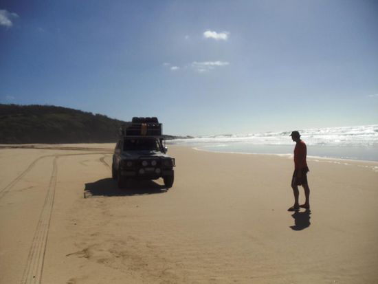 Am Donnerstagmorgen machen wir uns auf den Weg Richtung Fraser Island. Unser Tagesziel ist Hervey Bay. Von dort aus fährt dreimal täglich eine Fähre auf die Insel. Wir übernachten wieder auf einem sehr schönen Zeltplatz. Wir kaufen noch genug Lebensmittel und Getränke ein. Wir freuen uns auf die Insel, wurde sie uns doch von vielen Leuten sehr empfohlen. Am Freitag nehmen wir die Fähre um die Mittagszeit und erreichen nach knapp einer Stunde Fahrt Fraser Island. Wir überqueren die Insel zur Ostküste. Die Fahrt geht über sehr abenteuerliche Strassen mitten durch den Regenwald. Plötzlich stehen wir am Meer. Nun geht die Fahrt auf dem etwa hundert Meter breiten Sandstrand weiter. Es ist schon ein besonderes Gefühl, mit dem Auto mit 80 Stundenkilometern auf dem Strand und teilweise auch im Wasser zu Fahren. Leider spielt das Wetter nicht mit. Es regnet und der Himmel ist grau. Wir haben eine kleine Karte der Insel, auf welcher die Campingplätze eingezeichnet sind. Man kann hier auch an gewissen Abschnitten wild Campieren. Die Gebühren für das Campieren haben wir zusammen mit der Überfahrt bezahlt. Wir haben uns entschlossen, drei Nächte auf der Insel zu bleiben. Wir haben uns für die erste Übernachtung, ganz im Norden der Insel, einen Campingplatz ausgesucht. Wir verlassen den Sandstrand und müssen durch das Inland zu dem Campingplatz fahren. Hier bleiben wir das erste Mal im tiefen Sand stehen und kommen nur mit sehr viel Mühe weiter. Man muss mit sehr viel Schwung und Tempo durch diese hügelige Gegend fahren. Zu schnell darf man aber auch nicht fahren, weil die schmalen Strassen voller Unebenheiten und Löcher sind. Der nun starke Regen macht die ganze Angelegenheit nicht einfacher. Der Sand verwandelt sich in Sekundenschnelle in Matsch und Schlamm. Mit viel Mühe und einer schon langsam stinkender Kupplung finden wir den Campingplatz. Das ganze Areal ist mit einem hohen Zaun umgeben. Es hat viele Dingos hier und so werden die Campingplätze Dingosicher gemacht. Wir stellen unsere Zelte bei Regen auf und versuchen, mit Hilfe einer Blache, uns ein zusätzliches Zelt zu bauen. Auf diesem Zeltplatz treffen wir ein junges Paar aus Frankreich an. Patric und ich kochen uns Kartoffeln und auf dem Grill braten wir Würste. Wir laden das junge Paar zum Essen ein. Bei strömenden Regen und teilweise stehend, da unter unserem "Zelt" nicht vier Stühle Platz haben, geniessen wir die Mahlzeit. Das provisorische Zelt füllt sich immer wieder mit Regenwasser und alle paar Minuten kommt ein richtiger Sturzbach von Wasser neben uns herunter. Wir können sitzen und stehen wo wir wollen, wir werden alle irgendwann nass. Trotz allem haben wir es sehr lustig. Sehr früh verkriechen wir uns in die Zelte, der einzige trockene Ort.