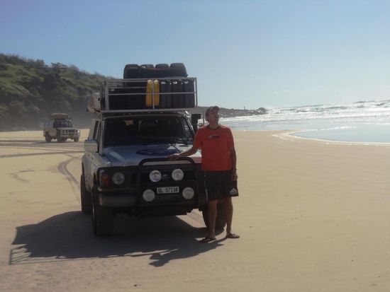 Wir werden von den ersten Sonnenstrahlen geweckt und freuen uns auf einen Tag mit blauem Himmel und Sonnenschein. Das Ziel heute ist ein See im Landesinnern. Der Lake Mc Kenzie. Da heute Sonntag ist, hat es sehr viel Tagesausflüger und Wochenendausflüger, dementsprechend hat es auch mehr Autos auf der Insel. Nach einer sehr schönen Fahrt dem Strand entlang, biegen wir ab Richtung Lake Mc Kenzie. Der strömende Regen in der Nacht hat die schlechten Strassen aufgeweicht und schlammig gemacht. Wir treffen auch sehr bald auf ein Fahrzeug, welches im Schlamm stecken geblieben ist. Ein zweites Fahrzeug versucht, die Familie mit drei Kindern aus dem Schlamm zu ziehen. Ohne Erfolg. Beide Fahrzeuge kommen keinen Millimeter vorwärts. Nun wird es Zeit für unsere Sandbleche. Es ist das Erste Mal, dass wir unsere Bleche vom Dach nehmen. Wir haben sie in der Schweiz sehr gut befestigt und dementsprechend schwer ist es auch, die Lederriemen zu lösen. Aus unseren Sandblechen werden nun Schlammbleche. Dank ihrer Hilfe aber, schaffen wir es gemeinsam, die Familie und ihr Auto aus dem Schlamm zu ziehen. Die Familie und vor allem die Kinder bedanken sich bei uns und den anderen Helfern. Wir erreichen den Lake Mc Kenzie, parken auf dem Parkplatz und gehen zu Fuss an den See. Der Anblick ist überwältigend. Ein schneeweisser Sandstrand und das Wasser schimmert in sämtlichen Blautönen. Uns ist das Wasser aber zu kalt, um dort zu Baden. Nach ein paar Fotos machen wir uns auf den Weg zu unserem Nachtlager. Wir treffen dort, direkt am Meer, früh genug ein und können unsere Zelt trocknen und bei Tageslicht aufstellen. Wir sind auch hier wieder ganz alleine. Auch dieser Zeltplatz ist nicht Dingosicher. Kurz vor dem Eindunkeln bekommen wir noch Nachbarn. Ein älteres Australisches Ehepaar. Sie versuchen, ihr ganz neues Zelt aufzustellen. Nicht ganz einfach. Patric und ich helfen ihnen dabei. Im Eifer des Gefechtes helfe ich ihnen in kurzen Hosen. Das Eindunkeln ist aber die Zeit der Mücken. Das Resultat sehe ich am nächsten Morgen. Meine Beine sind übersät von Stichen. Ich habe sicher an jedem Bein etwa hundert Stiche. Kein schönes Bild.