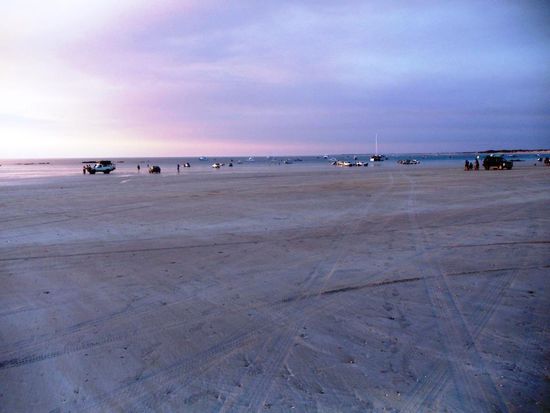 Wir schlafen alle aus und geniessen ein spätes, nahrhaftes, exzellentes Frühstück, welches uns Claudia zubereitet. Nach dem Frühstück gehen Sara und ich an den Town Beach. Sara geniesst die Sonne am Strand und ich gehe ins Café, um die Fotos für den Reisebericht auszuwählen und zu beschriften. Ich kann hier im Café meinen Laptop nicht am Strom anschliessen und so gehen wir in Matso's Brewery. Wir trinken ein lokales, frisch gezapftes Bier. Ich kann den Bericht ins Internet stellen während Sara die Live Music geniessen kann. Nach einer Stunde fahren wir zum Gantheaume Point und besichtigen die Fussabdrücke der Dinosauriers und Anastasia's Pool. Auch hier kann man mit dem Auto dem Sandstrand entlangfahren und den Sonnenuntergang geniessen. Der Sonnenuntergang ist heute um 17:40 Uhr. Wir sitzen gemütlich vor dem Nissan Patrol in unseren Campingstühlen als uns plötzlich in den Sinn kommt, dass man heute die Staircase to the Moon sehen kann. Wir räumen die Stühle in den Nissan und fahren auf die andere Seite wieder zum Town Beach. Es hat schon sehr viele Leute, doch wir finden nach kurzem Suchen einen Parkplatz. Es gibt hier einen Markt mit vielen Ständen, welche lokale Kunst und viele Esswaren anbieten. Auch hat es Musiker und Artisten, welche die Leute unterhalten. Uns gefällt der lokale Musiker "Fingers" besonders gut und wir hören ihm ein wenig zu. Er spielt Gitarre und gleichzeitig drei Didgeridoos. Die Leute sitzen hier im Park und Kinder und Erwachsene tanzen zu dieser von mir noch nie gehörten Musik. Sara gefällt die Musik so sehr, dass sie eine CD von bei ihm kauft. Der Mond kommt exakt um 18:06 Uhr feuerrot aus dem Meer. Zuerst verdeckt eine grosse Wolke den Mond, aber dann brennt er so richtig rot und durch die Reflektion und die Schatten, sieht es aus, als wäre da eine Treppe, auf welcher man zum Mond hinaufsteigen kann. Fotos kann man nur mit professionellen Kameras machen. Ich habe den Moment genossen und in mir gespeichert. Hungrig fahren wir zu Simon's Haus wo wir mit Apéro und einem ausgezeichnetem "Fish and Seafood" Nachtessen verwöhnt werden. Simon liebt nicht nur das Kochen - er beherrscht es auch! Dies ist unser letzter gemeinsamer Abend. Claudia und Sara fliegen morgen Abend ab und ich werde morgen auf dem Garagengelände "einziehen". Ein lustiger, geselliger und schöner Abend geht zu Ende und die Woche mit Sara und Claudia war eigentlich viel zu kurz.
