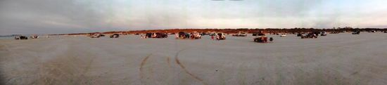 Ich wache bereits um sechs Uhr auf und sehe, dass im Büro Licht brennt. Ich kann mir momentan noch keinen Kaffee zubereiten, da mein Verlängerungskabel nicht mehr funktioniert. Karen macht mir Kaffee und wir quatschen ein wenig. Mich interessieren die Abläufe hier und sie ist die Frau, die hier alles kennt und auch alle administrativen Arbeiten macht. Ich beginne um sieben Uhr mit dem Reinigen und Ausmisten des neuen Büros. Simon will hier später mit dem Verkäufer einziehen. Ich mache immer wieder verschiedene Arbeiten und fahre Autos in der Stadt umher. Bei den Reinigungsarbeiten werde ich immer wie schmutziger und meine Hosen haben jetzt noch mehr Risse und Schlitze. Simon sagt mir, dass ich die zehn Uhr Pause nie verpassen soll, da man hier dann zusammensitzt. Die Mechaniker Crew besteht aus fünf Australiern, zwei Asiaten, einem Schweizer, einem Deutschen und drei Lehrlingen. Vielleicht gibt es auch noch mehr, da die Australier nicht immer zur Arbeit kommen und dann plötzlich wieder einmal auftauchen. Den restlichen Morgen verbringe ich mit dem Holen und Bringen von Neuwagen und Kundenautos. In der Mittagspause kaufe ich mir ein neues Verlängerungskabel und installiere meinen Campingplatz mit Strom. Es gefällt mir hier als "Junge für Alles" zu Helfen und zu Arbeiten. So erhalte ich einen Einblick und lerne alle Mitarbeiter kennen - Büroangestellte, Mechaniker, Verkäufer und die Lehrlinge. Am Nachmittag helfe ich Karl mit dem Montieren der Frontscheiben. Ein Road Train hat mir einen Stein in meine Frontscheibe gespickt und ich muss noch die Frontscheibe vom Nissan Patrol ersetzen. Ich mach dann das einmal nach Feierabend mit dem Karl zusammen. Dann wird es plötzlich hektisch und Simon ist nicht zufrieden. Ein Neuwagen ist nicht ablieferungsbereit und die Kunden warten schon. Auch der Verkäufer, Steve, springt ungeduldig umher. Karl ist auch zuständig für die Bereitstellung der Neuwagen, aber er wusste nicht, dass die Ablieferung bereits am frühen Nachmittag ist. Er ruft mich und wir reinigen zusammen den Hyundai. Ich arbeite noch ein wenig im neuen Büro und bin pünktlich um fünf Uhr in der Werkstatt um Feierabend zu machen. Jeder hat wieder eine Bierdose in der Hand und wir sprechen alle über den vergangenen Tag. Ich bin definitiv aufgenommen! Ich suche nach einem Fahrrad, so kann ich an den Strand und ins Zentrum radeln und benötige nicht den Nissan Patrol. Ein Lehrling hat ein defektes Fahrrad zu Hause und bringt es morgen in die Werkstatt. Er sagt, das Fahrrad benötigt eine neue Kette und zwei neue Pneus. Mal schauen mit was für einem Gefährt Dan morgen kommt.