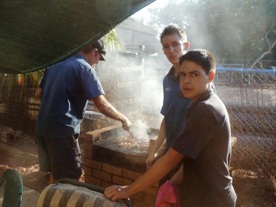 Dann war schon Feierabendstimmung. Big Wade (links) grilliert die Scampis, während die beiden Lehrlinge, Kieran und Eric hungrig auf das Essen warten