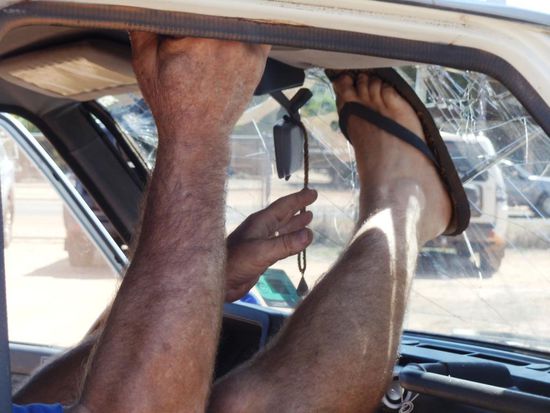 Am Samstag Morgen mussten wir die Frontscheibe ersetzen. Seit ich hier in Broome bin, hat sich der Riss um das doppelte verlängert
