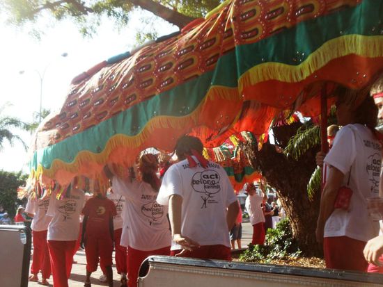 Der Sturm beschäftigt mich auch diese Nacht. Es ist wirklich schwierig, bei diesen Geräuschen durchzuschlafen. Es ist nicht nur mein Zelt, welches Geräusche macht, auch auf dem ganzen Garagengelände knirscht und klingelt es die ganze Zeit. Heute ist Shinju Matsuri - Broomes Festival der Perle. Ich weiss nicht genau was das ist, aber Karl, Karen und Erica sagten mir, ich soll unbedingt um zwei, drei Uhr Nachmittags in Chinatown die Parade anschauen gehen. Also habe ich mich mit Karl um ein Uhr verabredet, dass wir zusammen das anschauen gehen. Wir setzen uns ins Lustre und geniessen ein paar Bierchen beim Lunch. Es kommen immer wie mehr Leute und mir gefällt besonders, dass die Australier ihre eigenen Stühle und Tische mitnehmen und sie irgendwo aufstellen. Am besten gefällt mir, dass eine Familie ihre Stühle mitten auf dem Kreisel aufstellen, wo die Parade durchgeht. Finde ich einfach cool. Ich frage viele Leute, was es denn genau mit dieser Tradition oder mit diesem Festakt auf sich hat, aber die meisten Leute wissen es nicht so genau. "Es handelt sich um eine japanische oder chinesische Tradition und sie feiern den Drachen". Tja, das ist wieder einmal eine Aussage. Aber Hauptsache man ist dabei. Karl und ich haben einen sehr guten Platz im Lustre und können von unserem Tisch aus die Parade geniessen. Wir machen ein paar Fotos und dann habe ich endlich jemanden kennengelernt, der mir das Shinju Festival genau erklären kann: