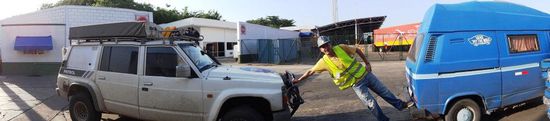 Für das Terminal müssen Fabian und ich lange Hosen und geschlossene Schuhe tragen. Johanna darf nicht mitkommen und bleibt im Hostel. Ich ziehe mich um und fahre zum Büro von Luis Ernesto. Es ist bereits sehr heiss und Fabian ist mit seinem blauen VW Bus bereits da. Er schwitzt auch schon recht und es ist eine "Tortur" mit diesen langen Hosen, Socken und geschlossenen Schuhen. Wir warten fast eine Stunde auf der Strasse vor dem Büro bis es losgeht. Es kommen noch zwei zusätzliche Fahrzeuge. Ein noch älterer VW Bus, in welchem ein Argentinische Paar und ein Hund, Jaika, sitzen. Dieser VW Bus sieht schon recht abgekämpft und innen chaotisch aus. Sie haben Pflanzen und Kräuter im Bus drinnen. Wir fragen uns, wie sie das immer alles über die Grenzen gebracht haben. Als Letzter kommt Pablo mit einem roten, alten Chevrolet und jetzt sind Fabian und ich definitiv überzeugt, dass wir uns mit unseren Autos keine Sorgen machen müssen, ob unsere Autos ohne technische Probleme durch Zentralamerika kommen. Dass dieses Fahrzeug überhaupt noch fährt, ist bereits ein kleines Wunder. Sonja, die Frau und Assistentin von Luis Ernesto, fährt mit ihrem Mann im Auto voraus und wir vier im Konvoi hinterher zum Terminal. Sonja kommt mit uns mit und regelt all die Formalitäten grossartig. Nach einer halben Stunde sind unsere Autos geparkt und alle Dokumente erledigt und unterschrieben. Wir schliessen unsere Fahrzeuge ab und sind überrascht, dass der Terminalmitarbeiter alle Schlüssel bei sich haben will. Fabian und ich protestieren zuerst, aber wir können da nichts dagegen machen. Es heisst, dass bei einem Notfall die Fahrzeuge bewegt werden müssen. Wir können die Fahrzeuge erst am Mittwoch in die Container fahren und wir wissen nicht, warum wir die Autos bereits heute aufs Terminal bringen müssen. Die Erklärung ist, dass es immer zwei Tage geht und morgen Dienstag, ein Feiertag ist. Na ja, Sonja versichert uns, dass alles gut ist und wir uns keine Sorgen machen müssen. Pablo, der grosse Argentinier mit dem roten Ghostbustermobil, muss dem Hafenarbeiter zeigen und erklären, wie sein Auto überhaupt anspringt. Lustig, lustig.... Zurück im Büro erklären uns Luis Ernesto und Sonja, was, wie und wo wir alles in Colon erledigen müssen. Sie geben uns die Adresse für ein Hotel, was vermutlich ein wenig teuer sein wird. Colon ist eine gefährliche Hafenstadt und im Hafen wird nur bis um zwei Uhr nachmittags gearbeitet. Später sei es zu gefährlich. Bevor wir dort zur Reederei gehen, müssen wir eine Autoversicherung für Panama abschliessen, da wir sonst unsere Autos nicht zurück erhalten. Der Ablauf und die Informationen sehen sehr gut aus - Sonja und Luis Ernesto machen einen wirklichen guten Job.