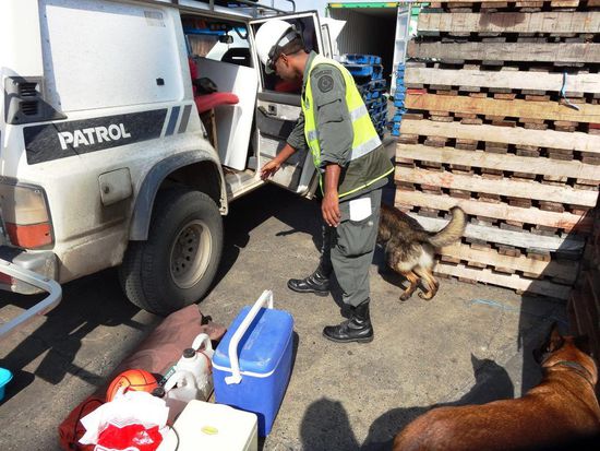 Da ich keinen Wecker organisiert habe, wache ich praktisch stündlich auf, damit ich ja nicht verschlafe. So stehe ich dann um sechs Uhr auf, frühstücke mit Clara, Luris und Mauricio. Mauricio muss wieder in das drei Stunden entfernte Santa Marta arbeiten gehen. Er kommt erst am Wochenende wieder zurück. Ich verabschiede und bedanke mich bei ihm, da ich ja morgen Nachmittag mit dem Segelschiff Cartagena in Richtung Panama verlassen werde. Ich bin pünktlich am Terminal und Fabian kommt auch bereits mit dem Taxi. Schweizerisch und pünktlich auf die Minute sind wir natürlich. Von den beiden Argentiniern ist nichts zu sehen. Ebenfalls fehlt Sonja. Zwanzig Minuten später kommt Sonja und erzählt uns, dass Pablo und Lucho nicht kommen werden. Für das Betreten des Terminals benötigt man eine Unfallversicherung. Fabian und ich haben die nötigen Unterlagen am Montag früh im Büro abgegeben. Fabian musste zwar noch eine "Nachtübung" mit seiner Schweizer Versicherungsgesellschaft und seinem Vater durchführen, da seine Versicherungskarte als Beweis nicht genügte. Ich hatte mit meinen selbst gebastelten Versicherungsunterlagen keine Probleme. Auf jeden Fall mussten Pablo und Lucho für je fünfzehn Dollar eine Versicherung abschliessen. Irgendwie haben sie es nicht geschafft, rechtzeitig das Geld zur Bezahlung aufzutreiben. Im Terminal fahren wir unsere Autos vor den grossen, grünen Container und müssen die Autos total ausräumen. Wir müssen immer wieder ein paar Dokumente unterschreiben und Sonja koordiniert alles perfekt. Sie ist eine wahre Hilfe. Zwei Polizisten vom Zoll kontrollieren sehr genau die Autos und was wir alles mitführen. Danach müssen wir eine gute Stunde auf die beiden Drogenhunde warten. Auch die beiden Hunde können nichts Beunruhigendes finden und so können wir alles wieder zusammenräumen und verstauen. Wir fahren unsere Autos in die Container und sie werden gut festgebunden. Bevor die Türe verschlossen und versiegelt wird, müssen wir auf den Chef warten. Während dieser Zeit trudeln Pablo und Lucho ein. Sie haben die Versicherung heute bezahlt und können jetzt die gleiche Prozedere durchmachen wie Fabian und ich. Es ist sehr lustig mit diesen beiden Künstlern. Pablo zeigt uns eine kleine Kostprobe seiner Einrad Kunststücke und erzählt uns, dass er bei seinen Vorführungen an den Kreuzungen bei den Ampeln gute Dreissig Tausend Pesos pro Stunde verdient. Das sind über fünfzehn Franken pro Stunde und er ist daher hier in Kolumbien ein Grossverdiener - sieht man seinem Auto gar nicht an. Später kommt der Chef und wir versiegeln den Container. Kurz vor der Mittagszeit ist alles erledigt und Fabian und ich sind froh und glücklich, dass bis jetzt alles so gut geklappt hat.