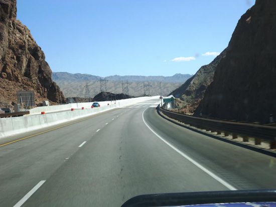 Ach ja, und noch was Interessantes: Die Grenze zwischen den Bundesstaaten Arizona und Nevada verläuft genau in der Mitte der Staumauer. Dies hat zur Folge, dass die östliche Hälfte der Hoover-Staumauer in die Zeitzone der Mountain Time (UTC-7 in Arizona) fällt, die westliche Hälfte in die Zone der Pacific Time (UTC-8 in Nevada). Der Zeitunterschied von einer Stunde lässt sich an zwei Uhren, die sich an den vorderen Entnahmetürmen befinden, ablesen. Im Sommer sind die Zeiten allerdings gleich, da in Arizona keine Sommerzeit gilt.