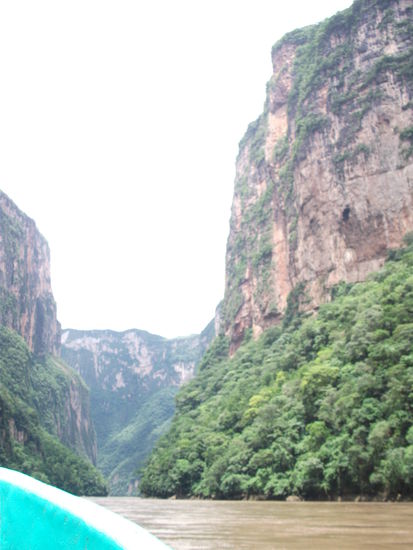 der tiefste punkt vom canyon war 1 kilometer, also schon sehr beeindruckend. was mehr beeindruckend war, waren eigentlich die krokodile, die dort leben in freier wildbahn, die so nach und nach von ihrem ruheplatz am uferrand, ins wasser krochen waehrend wir vorbei fuhren. und es waren wirklich einige dort, also sehr aufregend und dadurch das boot mit dem wir fuhren auch nicht reibungsfrei ging und nach einer zeit immer kurze ruhepausen braucht, dann sich nicht mehr anstarten lies und wir mit der stroemung weit abgetrieben sind...! war uns kurz mulmig, aber alles oke, die mexikaner sind sehr gut im improvisieren.