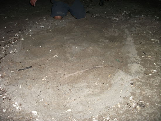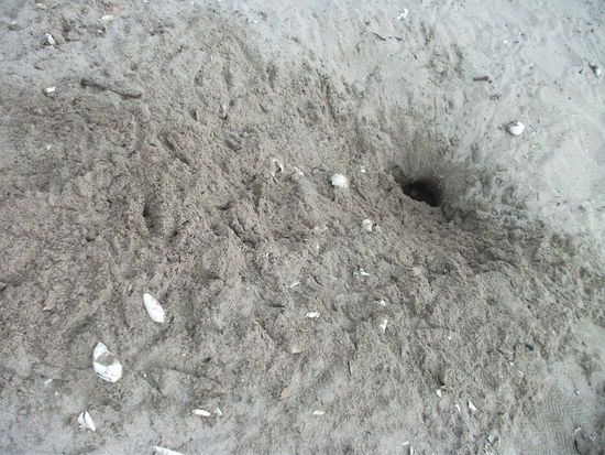 also die schildkroeten kriechen langsam mit pausen aus dem wasser, suchen eher eine stelle wo das wasser nicht raufkommt, und dann faengt die puddlerei an. mit den hinterhaxn, die sie echt verwenden als waere es eine schaufel, fertigen sie ein perfektes gemach (ca. halber meter tief und 20 cm durchmesser).