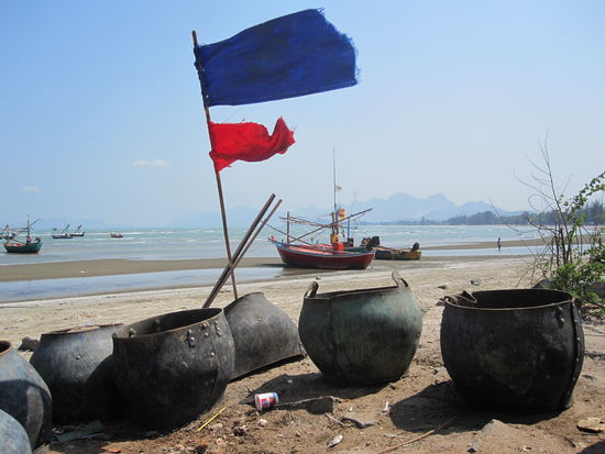 Strand von Hua Hin. Die Wassertemperatur muss hier ungefaehr 35 Grad haben (ist jedenfalls nur dezent kaelter als ein heisses Bad)