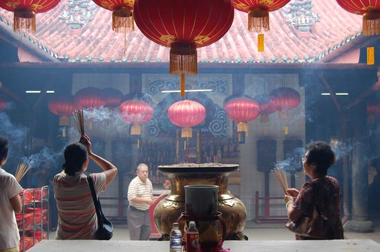 Die Menschen kaufen all das Zeug, was dann unter Gebet verbrannt wird (Räucherstäbchen und irgendwelches bedrucktes Papier und mehr). Wahnsinn, wenn man sieht, was da die Geldscheine über den Tisch gehen. Auch um den Tempel herum, lauter Shops mit diesen Dingen (Witzig die Warnhinweise bzgl. Umwelt und so auf den Plakaten um den Tempel herum )