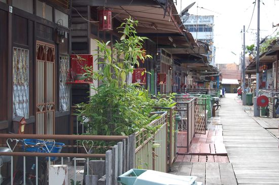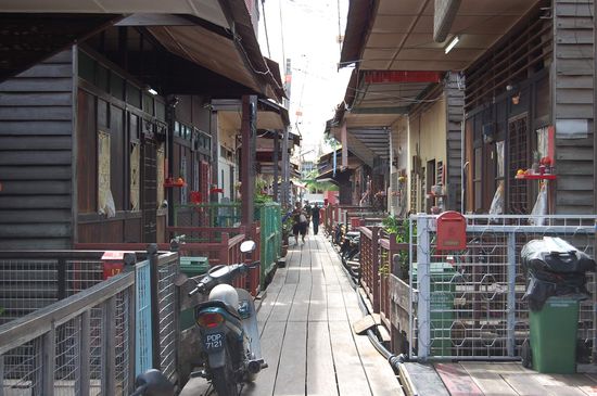 Am Meer sind wir dann auf, wir nennen es mal, Jetty-Häuser gestoßen. Dort sind auf Stelzen ins Wasser gebaute Holzhäuser zu beiden Seiten des Steges gebaut.
