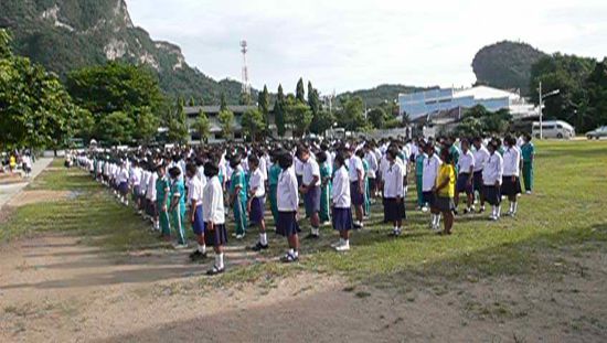 Bei der Ankunft in dieser Schule standen alle Schülerinnen und Schüler auf einer riesigen Wiese in Reih und Gied. Da wurde ganz vorne die thailändische Fahne gehisst und anschliessend sangen bzw. sprachen alle die Nationalhymmne im Chor.