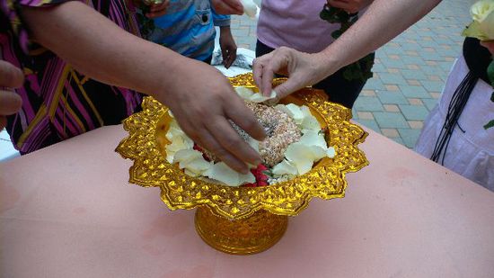 Ganz liebevoll helfen alle mit, den goldenen Teller mit Blumenblüten zu dekorieren