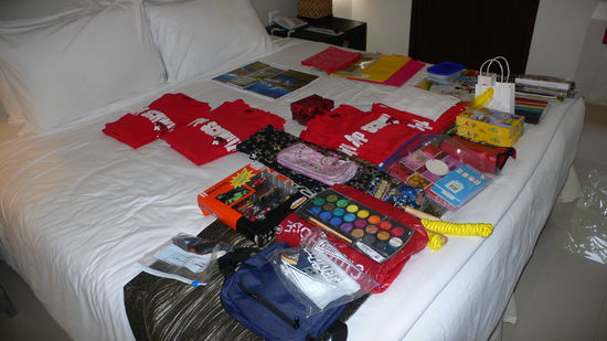 Normalerweise nimmt man sich jetzt etwas Zeit, um die Koffer auszupacken, sich ein bisschen umzusehen und gemütlich einzuleben - diesmal aber gar nicht! Wir leeren nur schnell alle Taschen und Koffer um die Geschenke auf dem Bett zu sortieren. Einige müssen heute noch mitgenommen werden, andere sind für später vorgesehen.