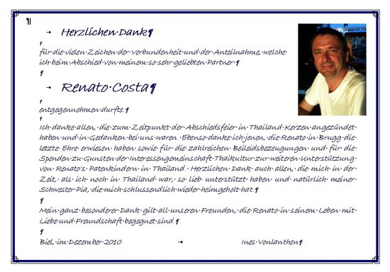 So fand ich im Dezember endlich die Kraft und die nötige Energie, die vielen lieben Zeichen und die Beileidsbezeugungen zu verdanken. Sollte ich jemanden vergessen haben, bitte ich um Verzeihung.