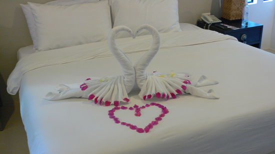 Im Zimmer sind wir sehr überrascht, dass man für uns eine riesige Dekoration mit den Tüchern gemacht hat. Zwei Schwäne in Herzform ... aber seht selber ...