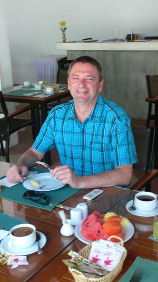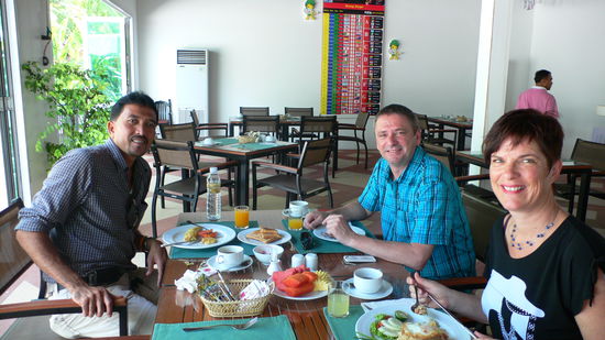 Als Prasit eintrifft - diesmal einiges zu früh, haben wir noch nicht gefrühstückt. Wir laden Prasit an unseren Tisch ein.