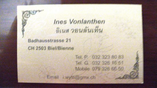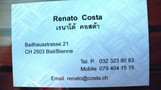 Renato und ich bestellen Visitenkarten mit unserer neuen Adresse in Biel. Da hat Renato plötzlich einen Blitzgedanken und wir lassen unsere Namen noch zusätzlich in Thaischrift dazu drucken. Er war ganz stolz und sagte zu mir, dass er nie gedacht hätte, mal Visitenkarten mit seinem Namen in dieser Schrift zu haben.