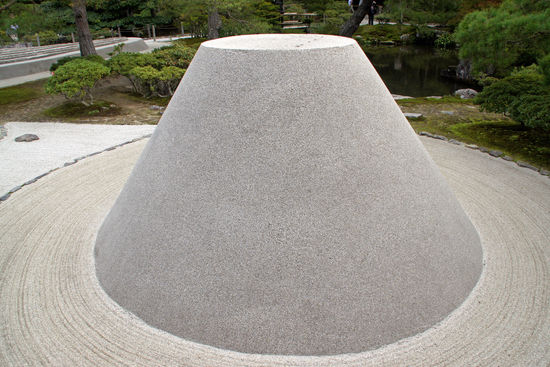 Die Besonderheit ist hier der zen-buddhistische Trockengarten. Es gibt nichts Grünes sondern ein sorgfältig geharktes Kiesbett in dem ein glitzernder und makellos glatter Sandkegel steht, der an den höchsten Berg Japans den Fuji-San erinnern soll.