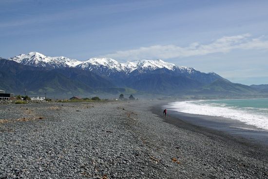 Das Meer und die Berge, ein unwiderstehliches Motiv, also sind wir zur Beach. Und da schlenderte "unser" Knutschipaar lustig zum Whalewatchtreffpunkt - ist Neuseeland wirklich nur so groß wie ein Dorf ????