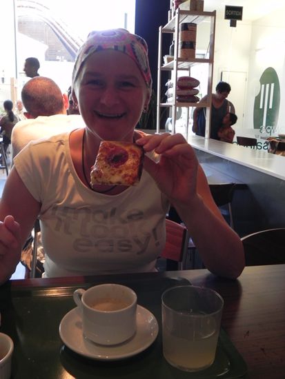 Ich habe Christa bei jedem Gang fotografiert, stellvertretend hier nur das Abschlusspizzastück Nr.5 beim Gang Nr.5 ("Eines rutscht immer noch rein...").