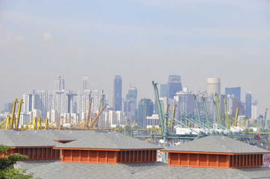 die Skyline von Sentosa Island aus gesehen (mit dem rießigen Hafen im Vordergrund)