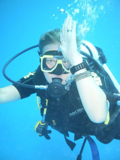 ...ich natürlich mit langem Anzug damit mich keine bösen Quallen dawischen (hat diesmal auch wirklich geklappt, dafür hab ich aber ordentliche Kratzer von Korallen an den Füßen; da hat manchmal die Tarierung nicht ganz hingehauen...)
