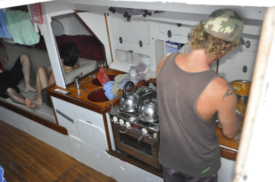 ...beim Small Talk mit einem Aussie-Passagier. Pete hat übrigens in einer Tour Zigaretten (ohne Filter) gewutzelt und geraucht und das auch bei 25 Knoten Wind! Ein Vollprofi halt!