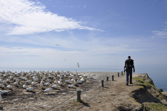 Und weiter gehts! Schon mal von den Australtölpeln oder auf englisch Gannets gehört? Wir nicht, deshalb mussten wir diese fliegenden Zeitgenossen natürlich live erleben. Große Brutkolonien dieser Vögel gibts bei Napier am Cape Kidnappers. Die haben wir uns angeschaut, natürlich nicht ohne vorher wie immer in Neuseeland einen ordentlichen Marsch hinter sich zu bringen.