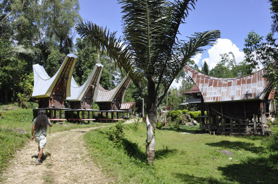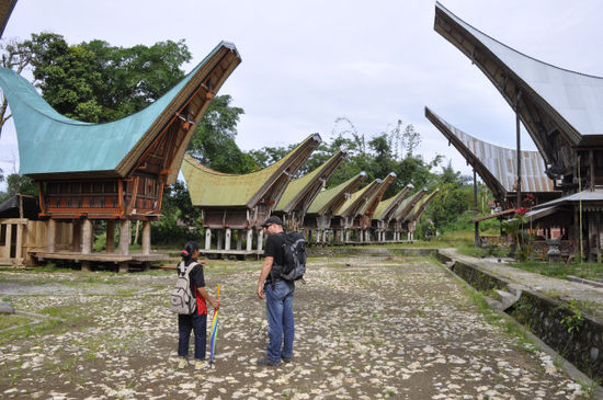 Besuch eines typischen Toraja Dorfes. Links unser Guide Wanda.