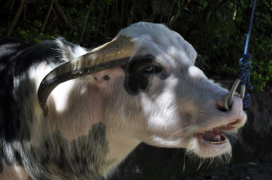 Ein weiterer 20.000 Euro Büffel. Für den Besitzer ist das, wie im Lotto gewonnen zu haben. Die Tiere werden übrigens so angebunden damit ihre Nackenmuskeln für die Büffelkämpfe gestärkt werden...