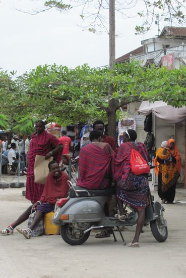 Aber hunderte von inoffiziellen 'Sehenswürdigkeiten' habe ich bei meinen Streifzügen ebenfalls entdeckt: Fliegende Händler mit mit mehr als voll gepackten Fahrrädern, die alles verkaufen, was der Mensch so brauchen könnte! Ein Souvenirladen in einer Seitenstraße, der von zwei Massais geführt wird - sie haben mit mir lange über Ihre Heimat, die Steppe, geredet und mir gezeigt, wie die typischen runden Perlenkragen hergestellt werden! Eine uralte Bäckerei, in der zwei alte 'Steinbacköfen', mit Holz befeuert, noch so zum Backen genutzt wurden wie bestimmt schon vor 100 Jahren - dort konnte ich mich auch täglich mit frischem Brot versorgen! Unzählige kleine Plätze, wo ich mit Kindern und auch Erwachsenen viele schöne Gespräche hatte, bei denen es auch viel zu lachen gab! Kleine Dachgarten-Restaurants, wo es (es war schließlich Ramadan!) auch tagsüber etwas zu essen und vor allem zu trinken gab! Viele, viele wunderschön geschnitzte alte omanische und neuere indische Tore und Türen oder besser Portale. Maler in ihren Werkstätten, die typischen Bilder im Tinga-Tinga-Stil in Arbeit, Freiluft-Werkstätten, wo Polstermöbel zwar in Serie, aber noch in Handarbeit hergestellt wurden, das riesige Marktgelände, teils im Freien, teils überdacht, wo es unter anderem auch köstliche frische Kokosnüsse gab!