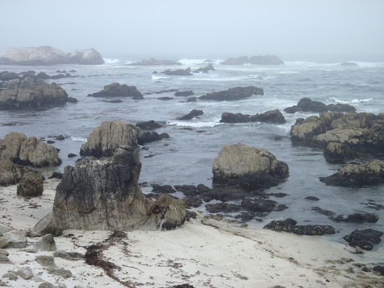 Zwischen Montery (wo wir eine Nacht verbracht haben) und Carmel by the Sea liegt der 17-Mile Drive, eine Privatstraße die zwischen Meer, Golfplätzen und sehr teuer aussehenden Häusern entlangführt. Für 9,50 Dollar pro Auto kann man grandiose Ausblike auf die Küste genießen und an vielen Aussichtspunkten anhalten. Wenn es nicht so kalt gewesen wäre, hätten wir sicher mehr Zeit damit verbracht die Wanderwege zu erkunden und die tollen Ausblicke in uns aufzusaugen. So waren wir aber immer wieder froh im Auto zu sein wo es wärmer war. Der Nebel, der immer dichter wurde, hat der ohnehin schon sehr wilden Küste einen mystischen Touch gegeben. Da konnte man sich gleich viel besser vorstellen wieso hier früher so viele Schiffe gesunken sind!