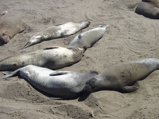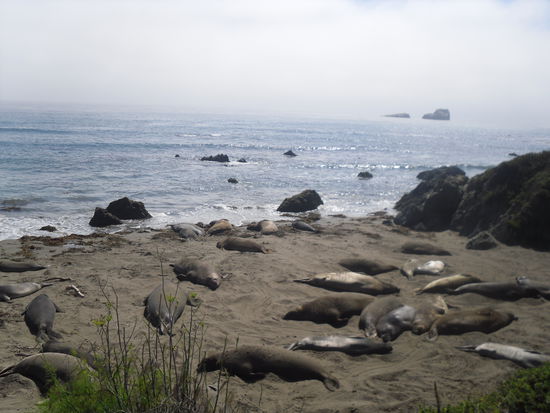 Etwas weiter südlich gelegen gibt es die Seeelefantenkolonie von San Simeon. Hier kann man das ganze Jahr über Seelefanten beobachten. Je nach Jahreszeit kommen weibliche oder männliche Seelefanten an den Strand um ihre Jungen zu bekommen oder sich zu häuten. Wir hatten "Pech" und haben nur ca 50 männliche Seelefanten gesehen. Im Frühjahr kann man wohl den Strand vor lauter Tieren nicht erkennen und sogar Geburten beobachten. Trotzdem war es sehr eindrücklich diese Tiere von so nah zu sehen und zu riechen Die Tiere machen ganz lustige Bewegungen mit ihrem Rüssel - ich hätte Stunden an der Holzreeling stehen können um sie zu beobachten, aber wir waren beide müde und wollten nur noch nach Santa Barbara wo wir die nächsten beiden Nächte verbracht haben. So ist der Stop bei den Seeelefanten relativ kurz ausgefallen.