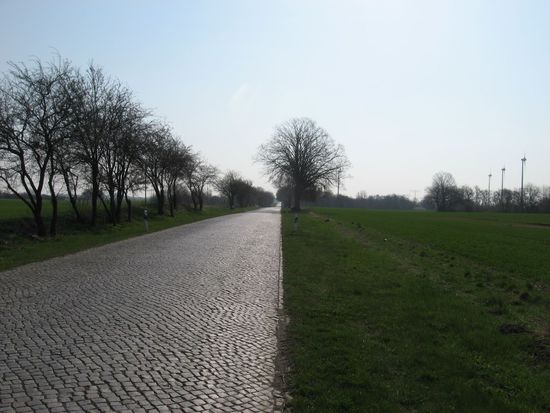 Es folgte eine etwa 12km lange Teststrecke für Mensch und Maschine in Form von Kopfsteinpflaster und bekannter Wellenform. Hier hatte ich dann alles verloren, was nicht wirklich fest war (Fahrradschlossabdeckung und Spanngurt). Nach einigen Kilometern war es dermaßen monoton, dass ich nur noch auf meine Pedale stierte und hoffte, dass es bald vorbei sei.