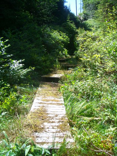Am naechsten Morgen arbeiteten wir an einem Bohlenweg, der von Beerenstraeuchern ueberwuchert war.