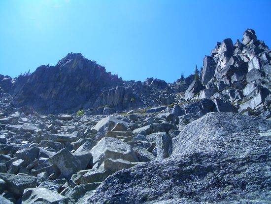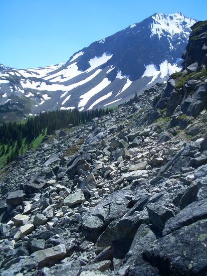Nach der Pause kletterten wir um den Grat herum durch eine riesiges Geroellfeld, Schutt und Schnee