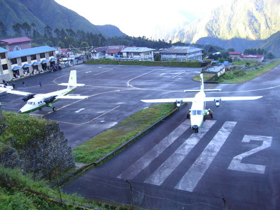 Der Landeanflug kommt. Die Landebahn hat eine Wahnsinns Steigung und so mitten aus dem nicht's taucht sie auf, in einer Schneise zwischen 2 Bergen.