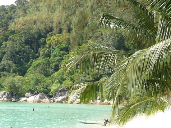 Einen riesen Kontrast zu den Chinesen bilden die Malayen. Da hier der muslimische Glaube vorherrscht, sticht der Kontrast enorm hervor. Die Chinesen - recht laut und immer praesent - und daneben die ruhigen, zurueckhaltenden Malayen. Diese sieht man lediglich abends ab ca. 17.30h, wenn sie im Grossfamilienverbund schwimmen gehen. Es ist ein ungewoehnliches Bild, wenn die Maedchen und Frauen komplett angezogen (mit Jeans, langaermeligen T-Shirt und Kopftuch) schwimmen oder sogar schnorcheln gehen... aber so ist eben jede Religion anders.